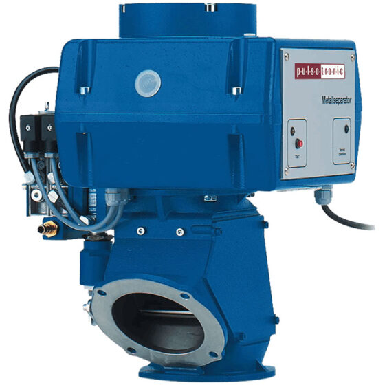 safely from the product stream. The robust, pneumatic driven mechanics guarantees durability. The function of the mechanics can be monitored constantly by several alerter. Thus the device constantly ensures that all metallic pieces have really been separated from the product stream.